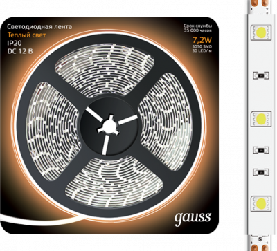 - GAUSS Лента светодиодная LED 5050/30-SMD 7.2W 12V DC теплый белый 5м (312000107)