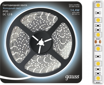 - GAUSS Лента светодиодная LED 5050/60-SMD 14.4W 12V DC холодный белый 5м (312000314)