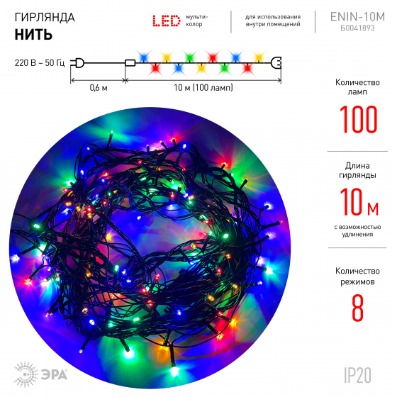 - ЭРА Гирлянда LED Нить 10 м ENIN-10M мультиколор 8 режимов, 220V, IP20 (60/720) (Б0041893)