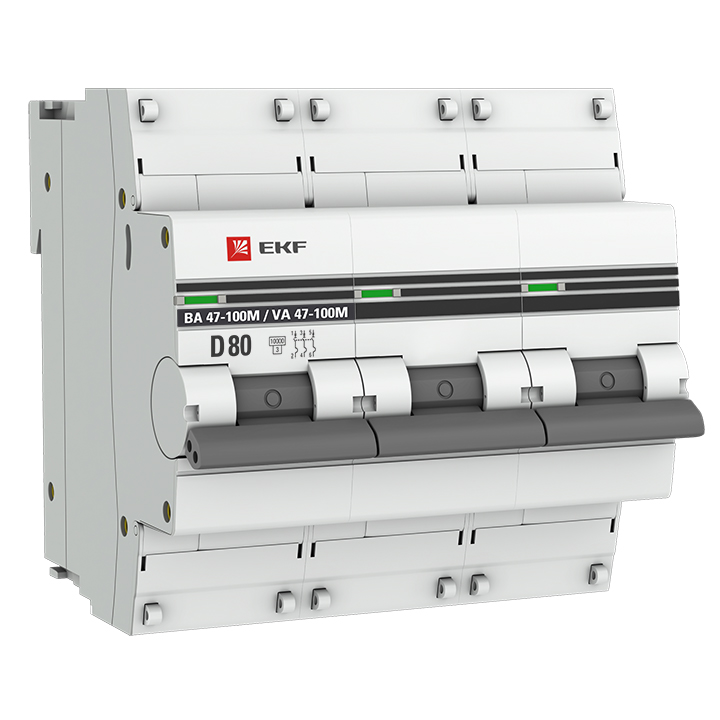 - EKF Автоматический выключатель 3P 80А (D) 10kA ВА 47-100M c электромагнитным расцепителем PROxima (mcb47100m-3-80D-pro)