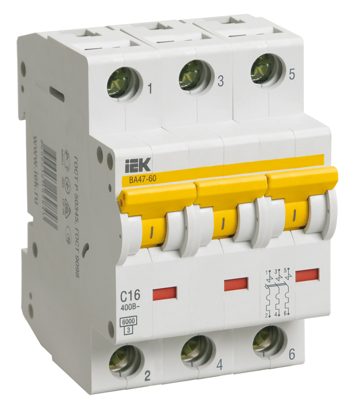 - IEK Выключатель автоматический трехполюсный 16А D ВА47-60 6кА (MVA41-3-016-D)