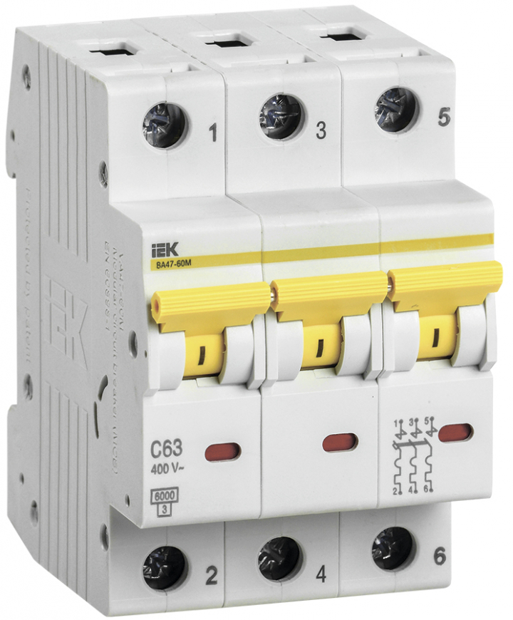 - IEK Выключатель автоматический ВА47-60M 3Р 63А 6кА С IEK (MVA31-3-063-C)