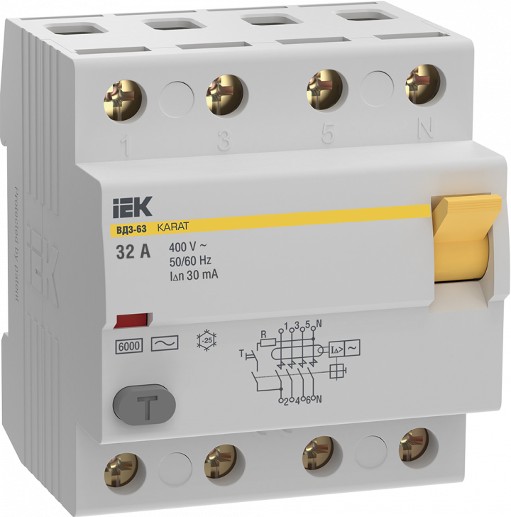 - IEK Выключатель дифференциальный (УЗО) KARAT ВД3-63 4P 32А 30мА 6кА тип AC IEK (MDV20-4-032-030)