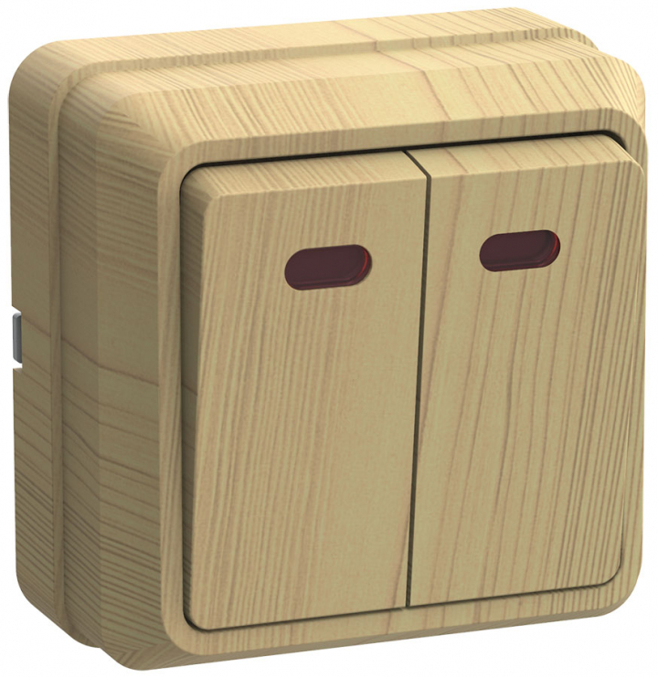- IEK ОКТАВА Выключатель двухклавишный наружный сосна с индикацией 10А (EVO21-K03-10-DC)